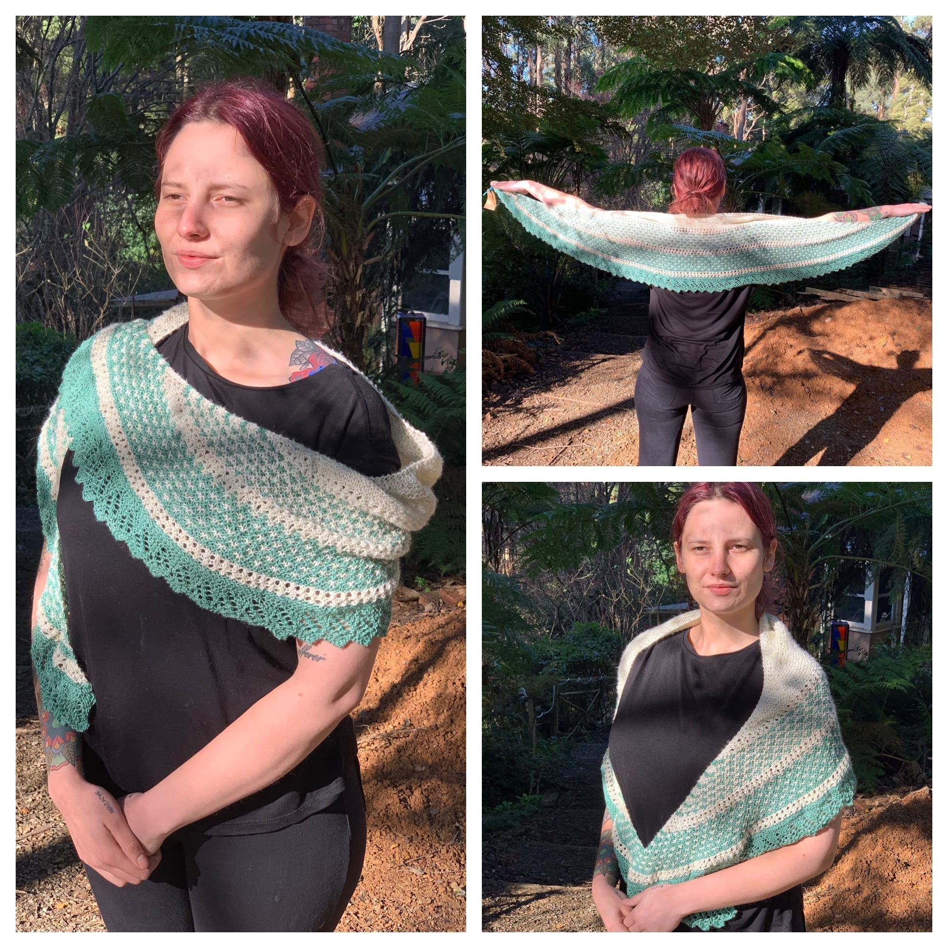 This is Spring Blossom Shawl in Sweet Pea’s Eternity and Whirlpool and the pattern is available Here
